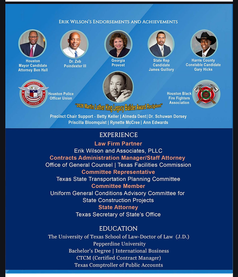 Erik spent 5 years in public service working for the Texas Secretary of State's office before transitioning to the private sector. After working for the state, he would go on to create his own Law Firm, Erik Wilson and Associates, with branches in Sugar Land and the Galleria to serve the greater Houston Area. Erik’s law practice has evolved to handle all major litigation for individuals and small business owners with a specialization in independent car dealerships.
